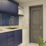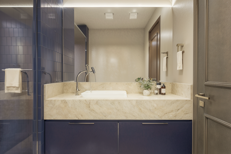 Privacidade: Porta de vedação acústica e Cortina blackout cinza.