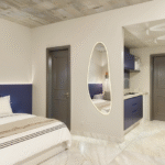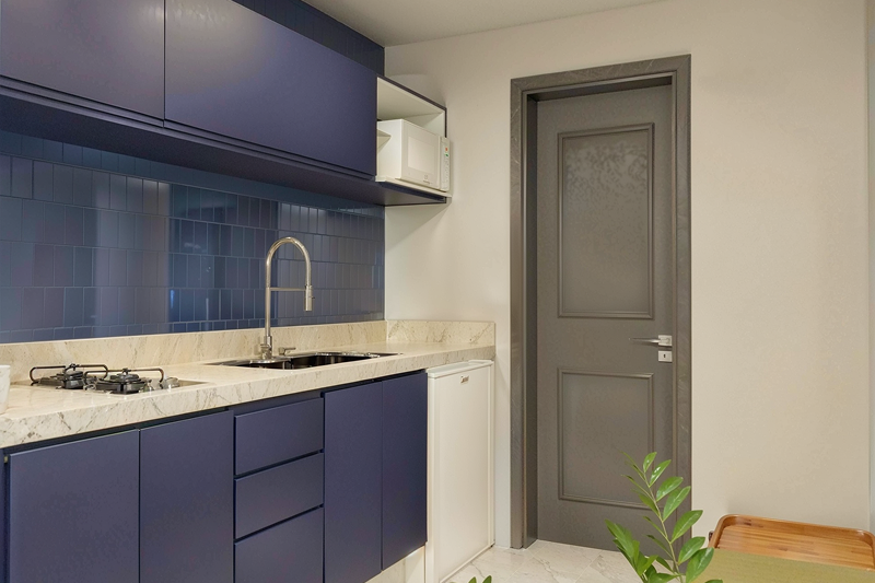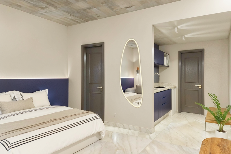 Um estúdio requintado de 30 m², ideal para casais ou pequenas famílias. Com design em mármore, oferece o máximo de tranquilidade graças à porta de vedação acústica e cortina blackout. Dispõe de uma mini varanda charmosa e uma mini cozinha funcional, combinando estética e conveniência para uma estadia memorável.
